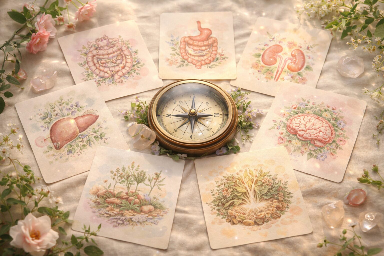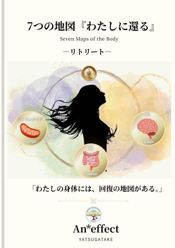 ① 7つの地図『わたしに還る』Seven Map Of Body —リトリート— 分子栄養学の難解な理論を、直感的に理解できるよう紐解いたガイドブック。消化、副腎、ミトコンドリア…あなたの細胞が語りかける言葉を読み解くための「辞書」となります。
